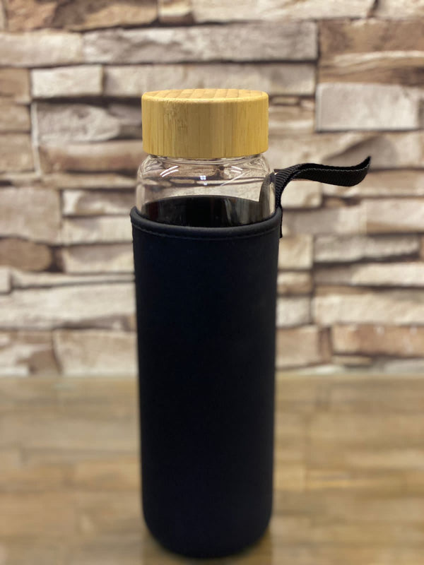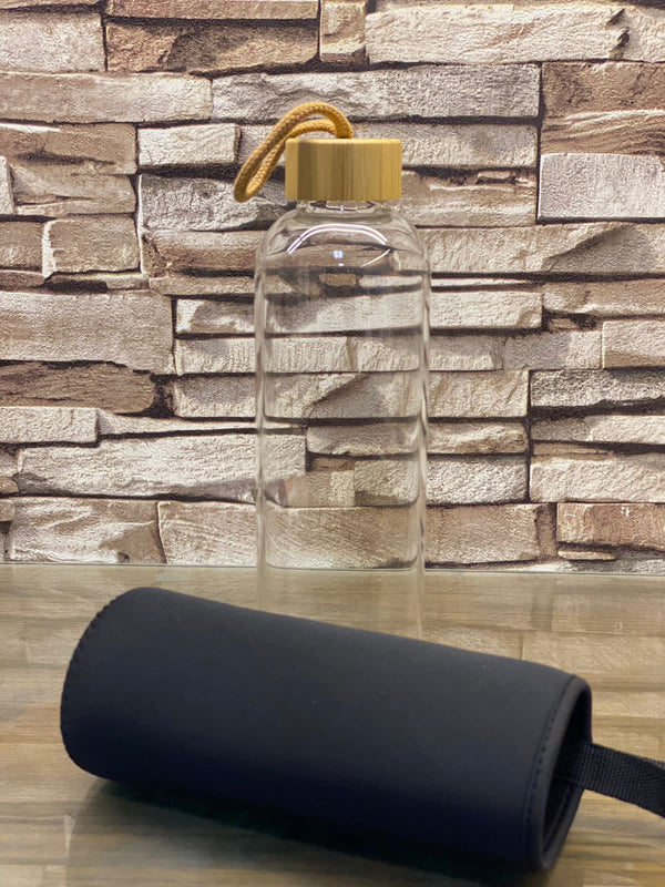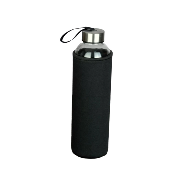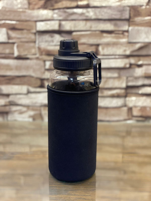 Glass water bottle with sleeve: The sleeve protects the bottle from bumps and scratches and Provides a non-slip gripping surface. NOTE: Neoprene has little smell, is totally normal and safe.