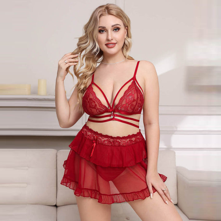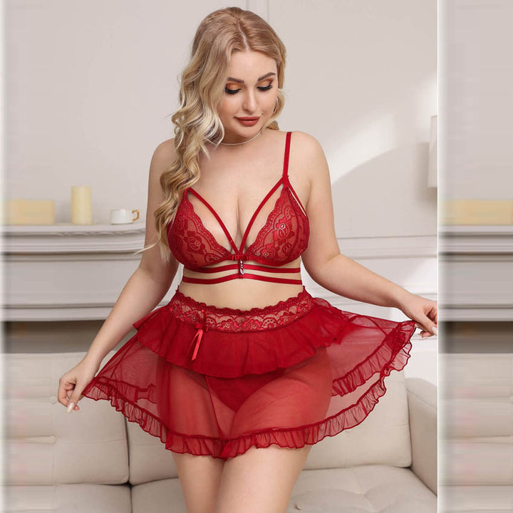 Strappy Style Fashion Lace Bralette & Sheer Ruffle Skirt Lingerie Set with Bowknot